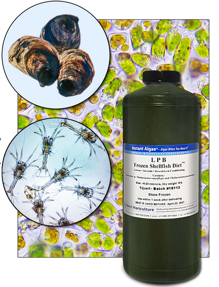 | LPB™ Shellfish Diet | Blend of 4 larger microalgae | 5-16 | 1 billion/ml | 3300 Liters of Isochrysis @2.3 million cells per ml | 15% | 2 years frozen 10 days refrigerated |
